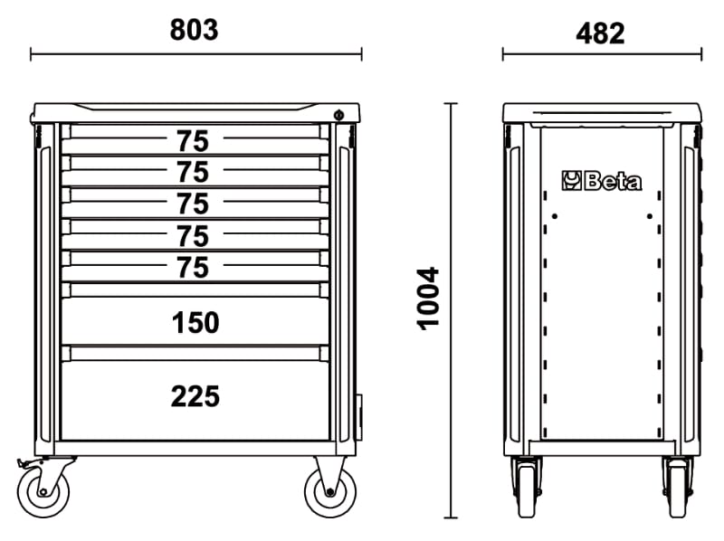 Paracolpi angolari Cassettiera portautensili Beta con 7 cassetti da 588x367 mm, montati su guide telescopiche a sfera: ? 5 cassetti altezza 75 mm ? 1 cassetto altezza 150 mm ? 1 cassetto altezza 225 mm Caratteristiche: ? Piano di lavoro multifunzione ad alta resistenza ? Portaminuterie e fori per l'alloggiamento dei giravite ? Sistema di apertura a sgancio rapido in alluminio posizionato su tutta la lunghezza del cassetto ? Paracolpi angolari morbidi su tutta l'altezza della cassettiera per evitare, in caso di urto, danni agli oggetti circostanti ? Piano dei cassetti protetto da tappetini di gomma espansa ? Quattro ruote ? 125 mm di cui 2 fisse e 2 girevoli (una con freno) ? Serratura di sicurezza centralizzata frontale ? Capacita di carico statico pari a 1000 kg ? Portaflaconi e portacarta laterali integrati regolabili in piu posizioni
