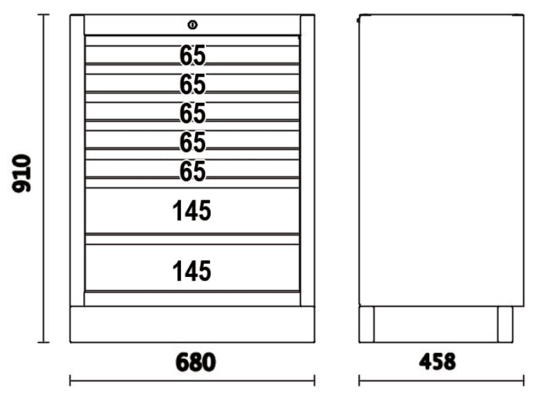 Caratteristiche: ? 7 cassetti da 566x406 mm, montati su guide telescopiche a sfera ? Piano dei cassetti protetto da tappetini di gomma espansa ? Serratura centralizzata frontale ? Dotato di piedini regolabili in altezza ? Predisposizione per l'inserimento dei termoformati