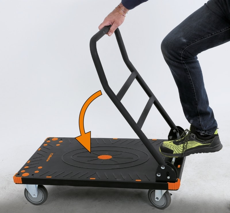Caratteristiche principali: ? Pianale di carico in polipropilene (PP) rinforzato, con rivestimento antiscivolo e inserti in TPV per la protezione degli spigoli ? Maniglia richiudibile per uno stoccaggio rapido e poco ingombrante ? Quattro ruote antitraccia ? 125 mm: 2 fisse e 2 girevoli con freno ? Portata massima 300 kg ? Larghezza utile pianale di carico: 705 mm ? Profondita pianale di carico: 480 mm ? Altezza pianale di carico: 200 mm
