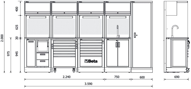 Combinazione composta da: ? 1 Piano di lavoro da 2.240x630 mm (RSC50 PG/3-2,2MT) ? 1 Modulo fisso di servizio con 2 cassetti (RSC50 MS-2C) ? 1 Cassettiera mobile con 7 cassetti (RSC50 C7) ? 1 Modulo fisso con 7 cassetti (RSC50 M7) ? 1 Modulo fisso con lavandino integrato (RSC50 ML) ? 4 pensili a muro (RSC50 PM) ? 4 pannelli forati portautensili superiori (RSC50 PFS) ? 4 pannelli forati portautensili inferiori (RSC50 PFI) ? 4 coppie montanti DX-SX (RSC50 P/2MDX-SX) ? 1 Armadio ad 1 anta (RSC50 A1)