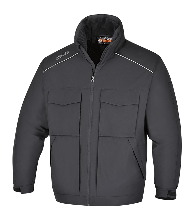 Materiali:? Tessuto esterno: 100% poliestere 50D, impermeabilizzato e resistente ? Tessuto interno: 100% poliestere ? Imbottitura: 100% poliestere ? Collare: fleece 95% poliestere, 5% spandex Caratteristiche:? Chiusura frontale con zip ? Due tasche al petto con chiusura a strappo ? Due tasche in vita con chiusura zip ? Tasca interna al petto con chiusura zip verticale ? Tasca interna al petto ? Taschini portapenne sulla manica ? Polsini elasticizzati e regolabili a strappo ? Vita regolabile a strappo ? Tasca interna per consentire la personalizzazione del capo ? Dettagli reflex Colore:Nero con dettagli reflex Taglie:XS, S, M, L, XL, XXL, XXXL, XXXXL
