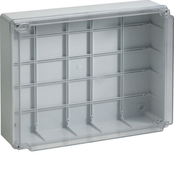 Cassetta di derivazione stagna Pico, misura 07, con coperchio trasparente e fianchi lisci per un’installazione versatile e sicura, sia indoor che outdoor. Realizzata in ABS autoestinguente grigio (RAL 7035), è resistente ai raggi UV e agli urti IK08 (EN 62262). Il sistema di chiusura con viti metalliche assicura sicurezza e una protezione IP56. Dimensioni 380x300x120 mm (LxHxP).