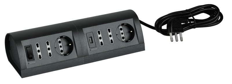 Multipresa da scrivania precablata con 4 prese bipasso 10/16A, 2 prese tedesche P30, interruttore luminoso e due prese USB alimentate 5V - 1A max, con 2 m di cavo, 250 Va.c. grigia