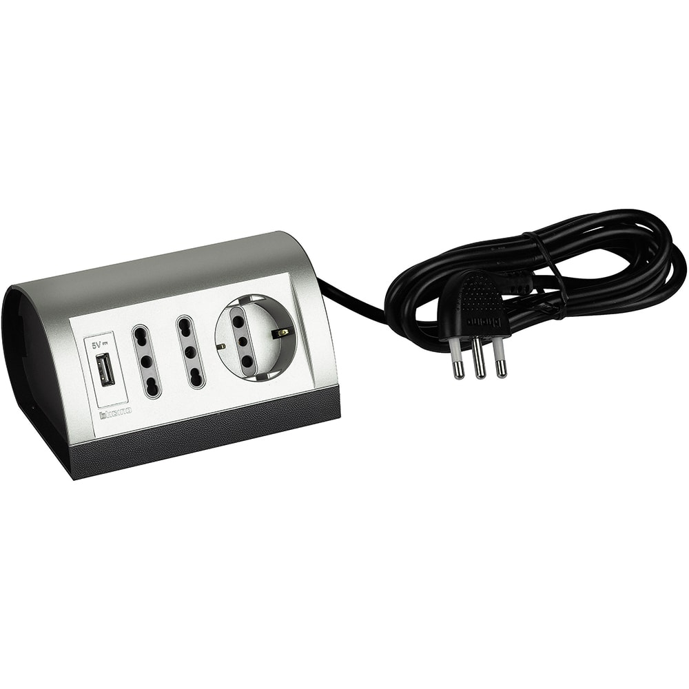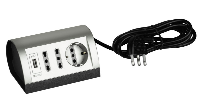 Multipresa da scrivania precablata con 2 prese bipasso 10/16A, una presa tedesca P30 e due prese USB alimentate 5V - 1A max, con 2 m di cavo, 250 Va.c. tech