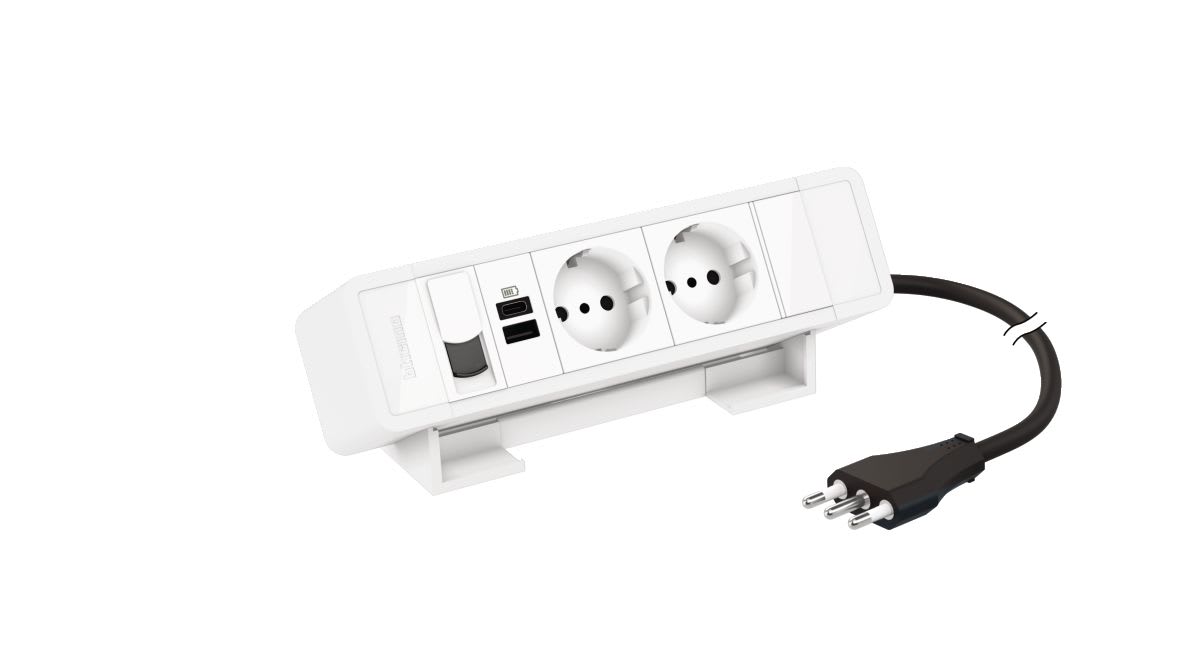Multiprese per scrivania equipaggiate con n° 2 prese P30 + n°1 USB A+C 15 W + RJ45 MatixGO - 8 moduli - Finitura coperchio: bianco.Materiale: alluminio e ABS. Le dimensioni sono ottimizzate per occupare poco spazio sulla postazione di lavoro. Sono progettate con una inclinazione che rende più agevole l’inserimento e la rimozione delle spine cablate e dotate di un cavo da 2m con una spina 2P+T. Conformi allo standard NFC61-314. La potenza massima è di 3680W a 230V~ per circuito. Fissaggio con nastro biadesivo fornito (il nastrobiadesivo può essere rimosso senza danneggiare i mobili).