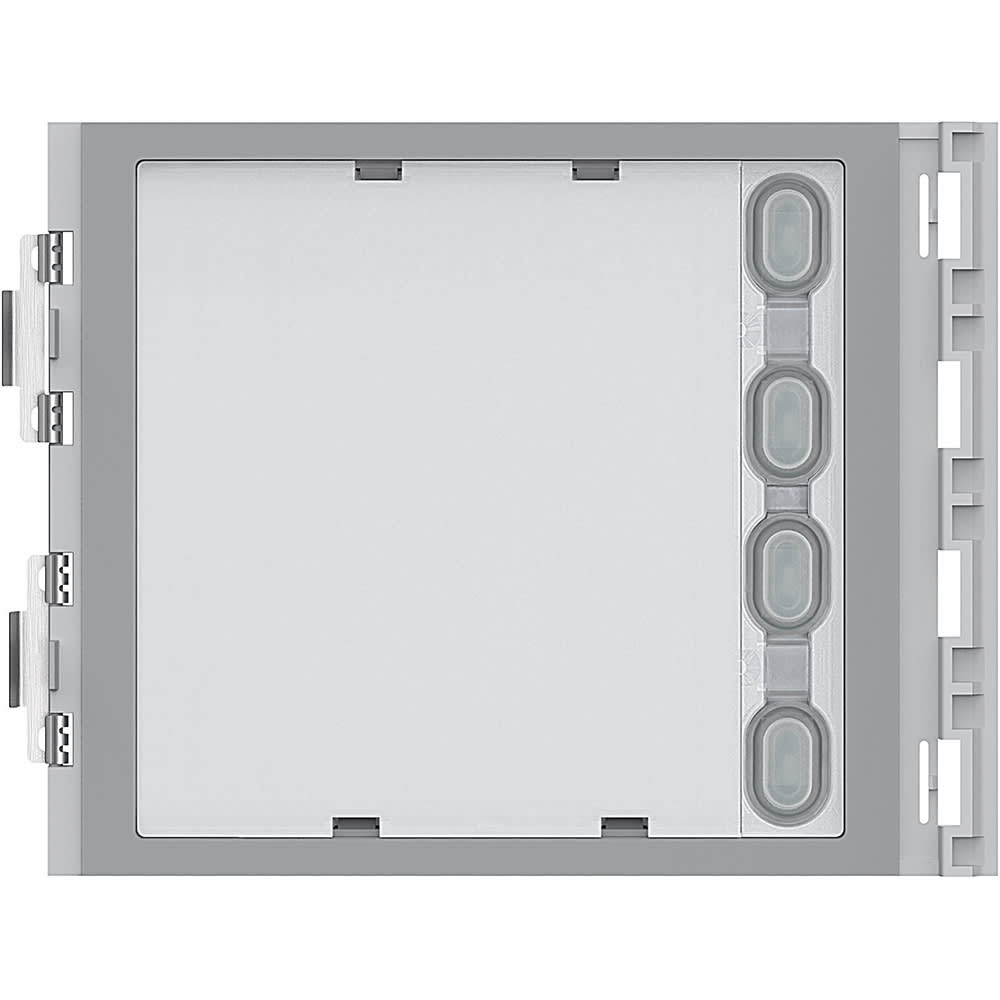 Modulo Sfera con 4 pulsanti aggiuntivi disposti su colonna singola. Da utilizzare in abbinamento ai moduli fonici 351000 - 351100 ed ai moduli audio video 351200 - 351300. Collegamento tramite apposito multicavo fornito a corredo. Retroilluminazione cartellini portanome comandata dal modulo fonico o dal modulo audio video abbinato. Da completare con frontale di finitura.
