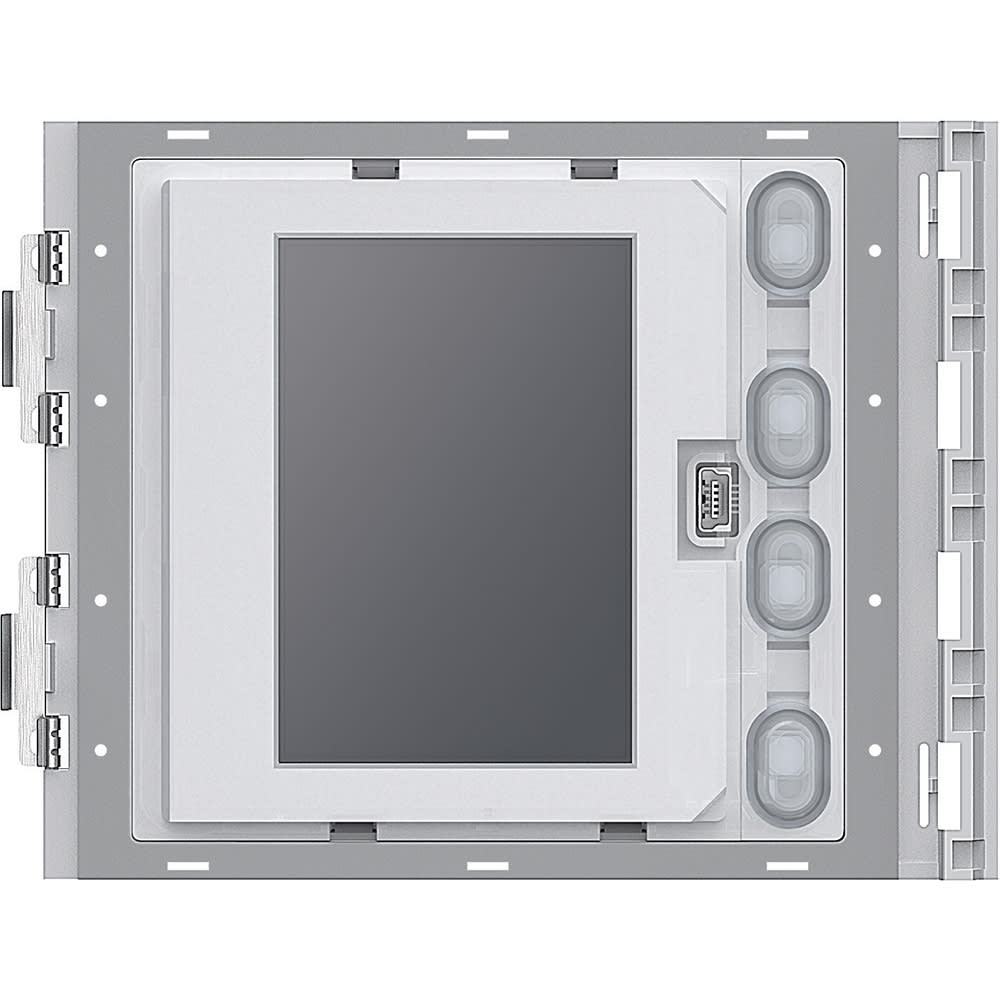 Modulo con display grafico da abbinare al modulo fonico 351100 oppure ai moduli audio video 351200 - 351300 (collegamento tramite multicavo fornito a corredo). Può funzionare in due modalità: chiamata da rubrica o chiamata digitale. La chiamata da rubrica consente l’invio della chiamata scorrendo sul display i nominativi associati ai residenti. È possibile memorizzare 4000 nominativi residenti. In abbinamento al modulo tastiera 353000 è possibile effettuare anche la chiamata diretta all’appartamento, semplicemente componendo il numero corrispondente al residente. La chiamata digitale, viene effettuata sempre in abbinamento con il modulo tastiera 353000 tramite digitazione di codice numerico. Si consiglia di affiancare alla pulsantiera uno o più moduli targa 352200 per visualizzare la corrispondenza tra codici numerici e nominativi utenti. È possibile programmare i nominativi nella rubrica in due differenti modalità: inserimento manuale tramite i pulsanti del modulo display oppure inserimento tramite PC con software specifico effettuando il download del file al modulo display (CONSIGLIATO). La mancanza di alimentazione dell’impianto NON causa la perdita dei dati memorizzati. Da completare con frontale di finitura.