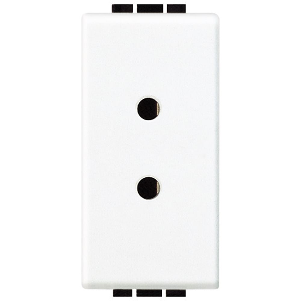 Presa per contatto diagnostico. Consente di interfacciare al sistema di chiamata un dispositivo diagnostico automatico. Quando il dispositivo diagnostico rileva un\'anomalia, attraverso questa presa, collegata al terminale di camera, una specifica segnalazione avverte il personale di presidio mediante una specifica segnalazione sul sistema di chiamata infermiera. Con 2 alveoli di diametro 3 mm e interasse 13 mm. Dispositivo 1 modulo - serie civile.