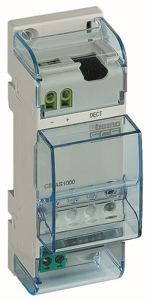 Interfaccia DECT. Collegata al bus scs, consente l\'inoltro di informazioni testuali al sistema DECT. Protocollo standard di comunicazione ESPA444. Dispositivo 2 moduli DIN.