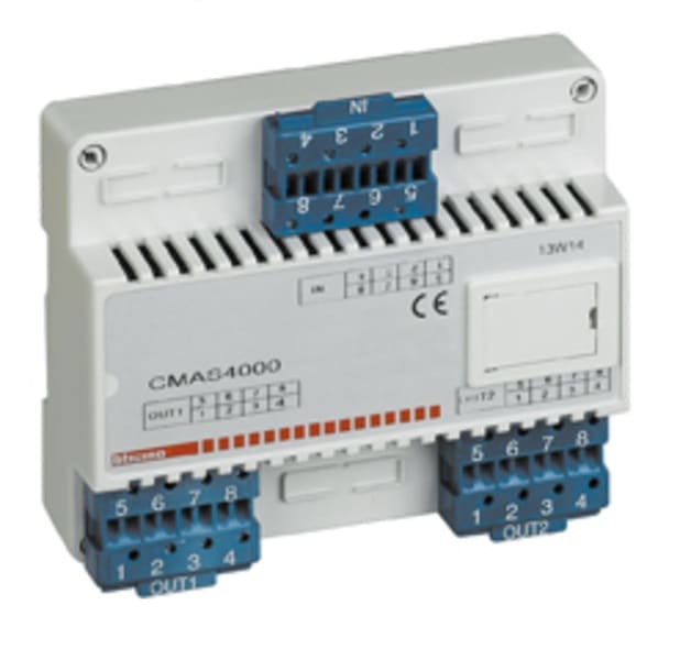 Modulo espansore di camera. Il dispositivo consente la connessione sino a 4 pulsantiere paziente o 4 tiranti bagno oltre a quello già disponibile. Il CMAS4000 deve essere utilizzato con i terminali di camera art.CMTE1100 e CMTE1200.