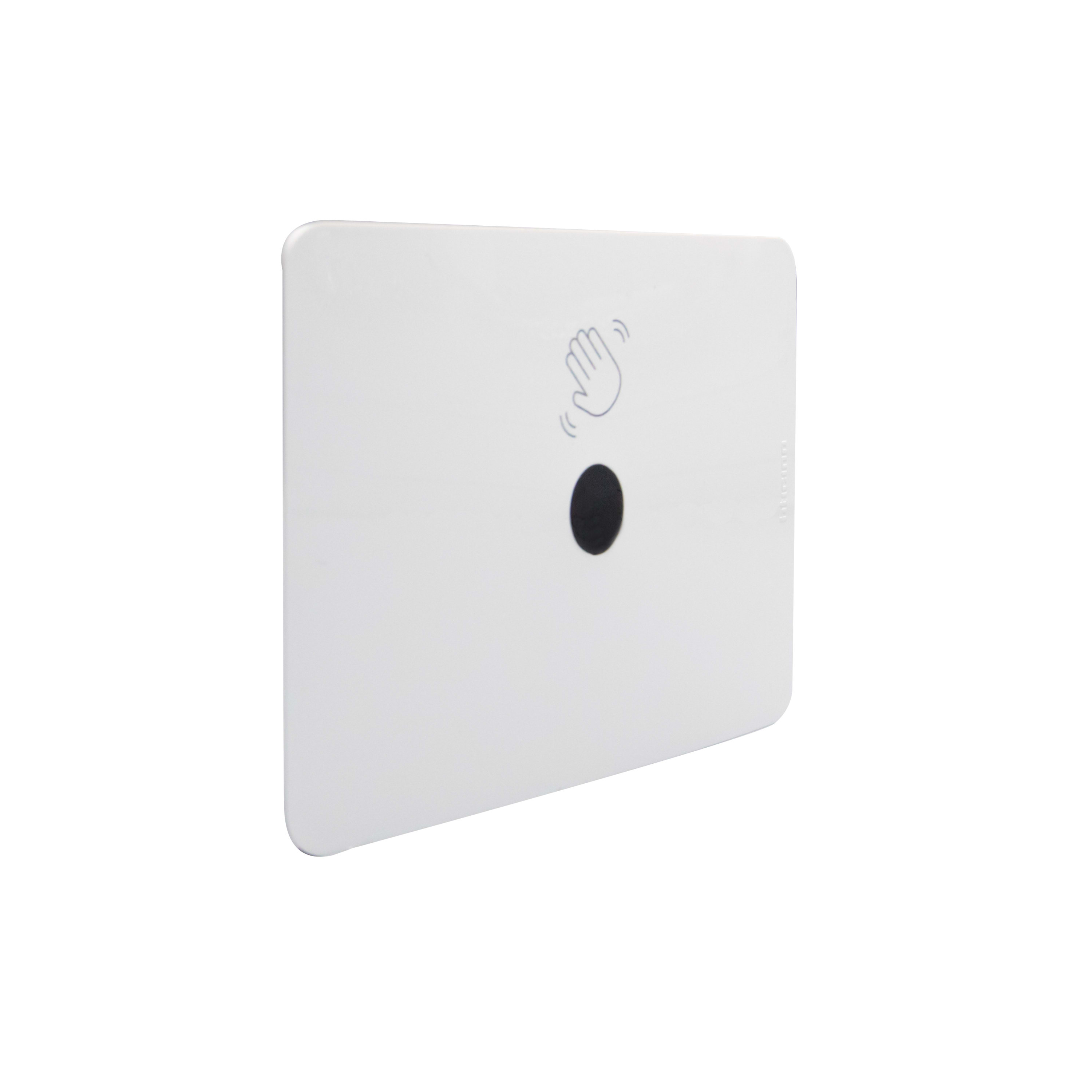 Pulsante touchless - a sfioramento - per porte e serrature elettriche o elettromagnetiche. Permette l’apertura della porta tramite lo sfioramento frontale con la mano, del dispositivo. Distanza di rilevamento selezionabile tra 10 cm (impostazione di default) fino a 30 cm, spia LED attivata di default (può essere disattivata). Profondità del meccanismo 25 mm, compatibile con tutte le scatole da incasso.Alimentazione 12 - 24 - 48 V cc. Funzionamento in 2 modalità: - ON/OFF o impulso- NC/NO- 3 moduli (monoblocco)- bianco antibatterico