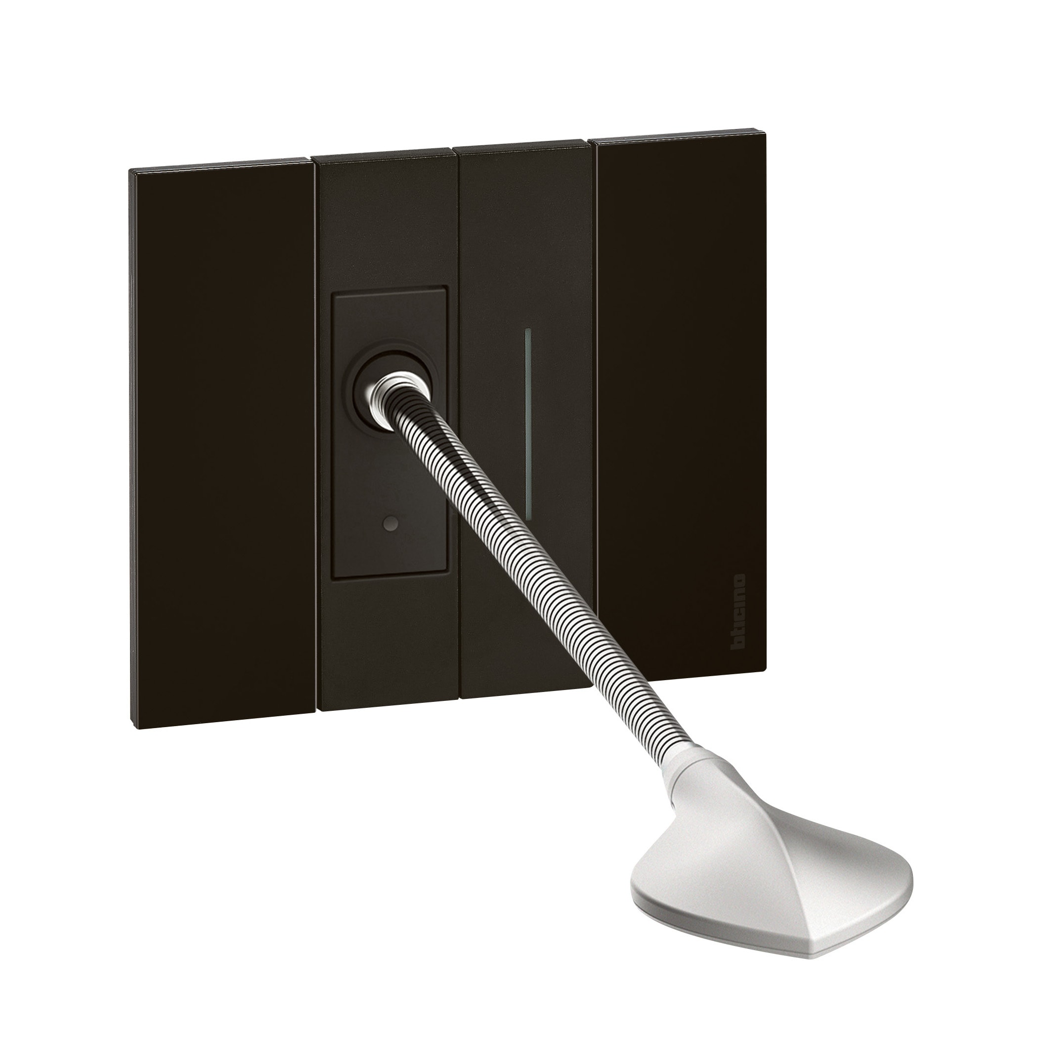 Lampada da lettura dimmerabile - si installa alla testa del letto permettendo di disporre di una illuminazione direzionale. E\' dotata di un braccio flessibile (lungh. 31 cm) che permette di orientarne l\'estremità illuminante. L\'intensità luminosa è dimmerabile mediante la pressione prolungata del comando di accensione/spegnimento integrato. Può anche essere collegata ad un comando remoto e se necessario, è possibile disabilitare il comando integrato con una pressione di 30 sec. - Lampada LED - Consumo3W - Flusso luminoso 110 lumen (equivalente a 15W ad incandescenza) - Durata 40.000 ore - 1 modulo (da incasso), Nero