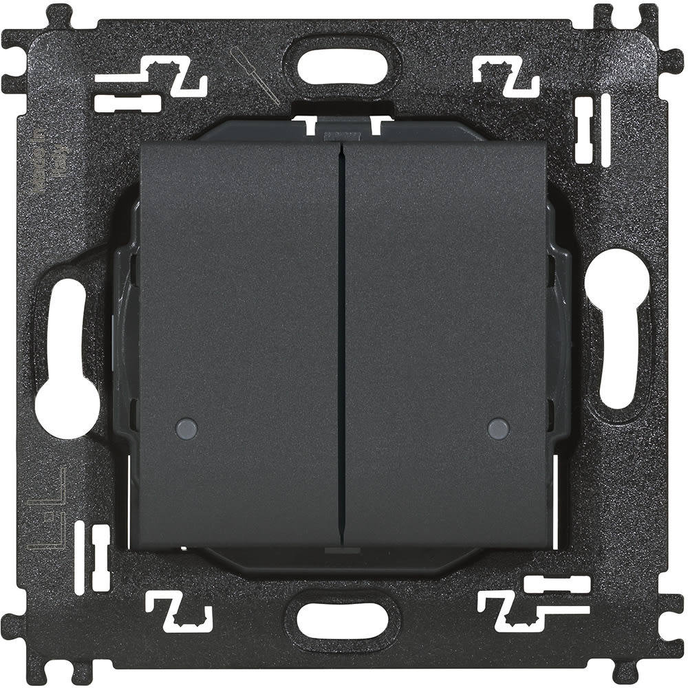 Comando doppio luci wireless dotato di due pulsanti per il controllo di due diversi dispositivi connessi per il comando di luci. Ogni singolo pulsante può essere associato ad uno o più dispositivi. Installazione superficiale con adesivi riposizionabili (forniti a corredo) o su scatole da incasso. LED integrato per la segnalazione batteria scarica. Alimentazione a batteria 3 V tipo CR2032 (fornita a corredo) con autonomia di 8 anni - 2 moduli.