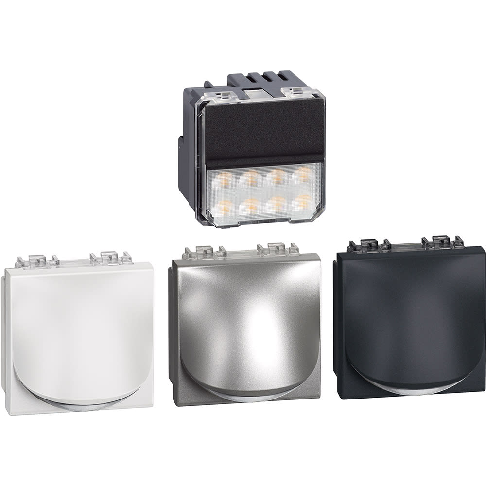 Lampada direzionale che consente di creare una illuminazione direzionale e decorativa. Se ne consiglia l\'installazione a 30cm dal suolo - Può essere comandata da un interruttore standard o da un interruttore elettronico senza neutro, da un dimmer o da un interruttore automatico con neutro - Lampada LED - Consumo 2,2W - Flusso luminoso 70 lumen - Durata: 50.000 ore circa - fornita in confezione con base neutra e mostrine di finitura nei colori bianco, Tech, antracite - 2 moduli