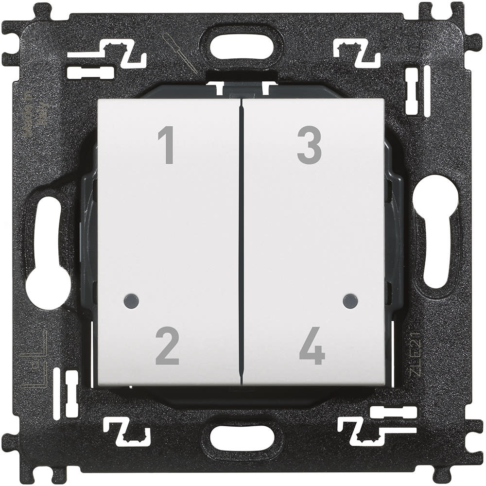 Comando 4 scenari wireless dotato di pulsanti contrassegnati 1,2,3 e 4 per l’attivazione di 4 scenari attivabili e personalizzabili dall’app Home + Control. Installazionesuperficiale con adesivi riposizionabili (forniti a corredo) o su scatole da incassoLED integrato per la segnalazione batteria scarica. Alimentazione a batteria 3V tipo CR2032 (fornita a corredo) con autonomia di 8 anni - 2 moduli.