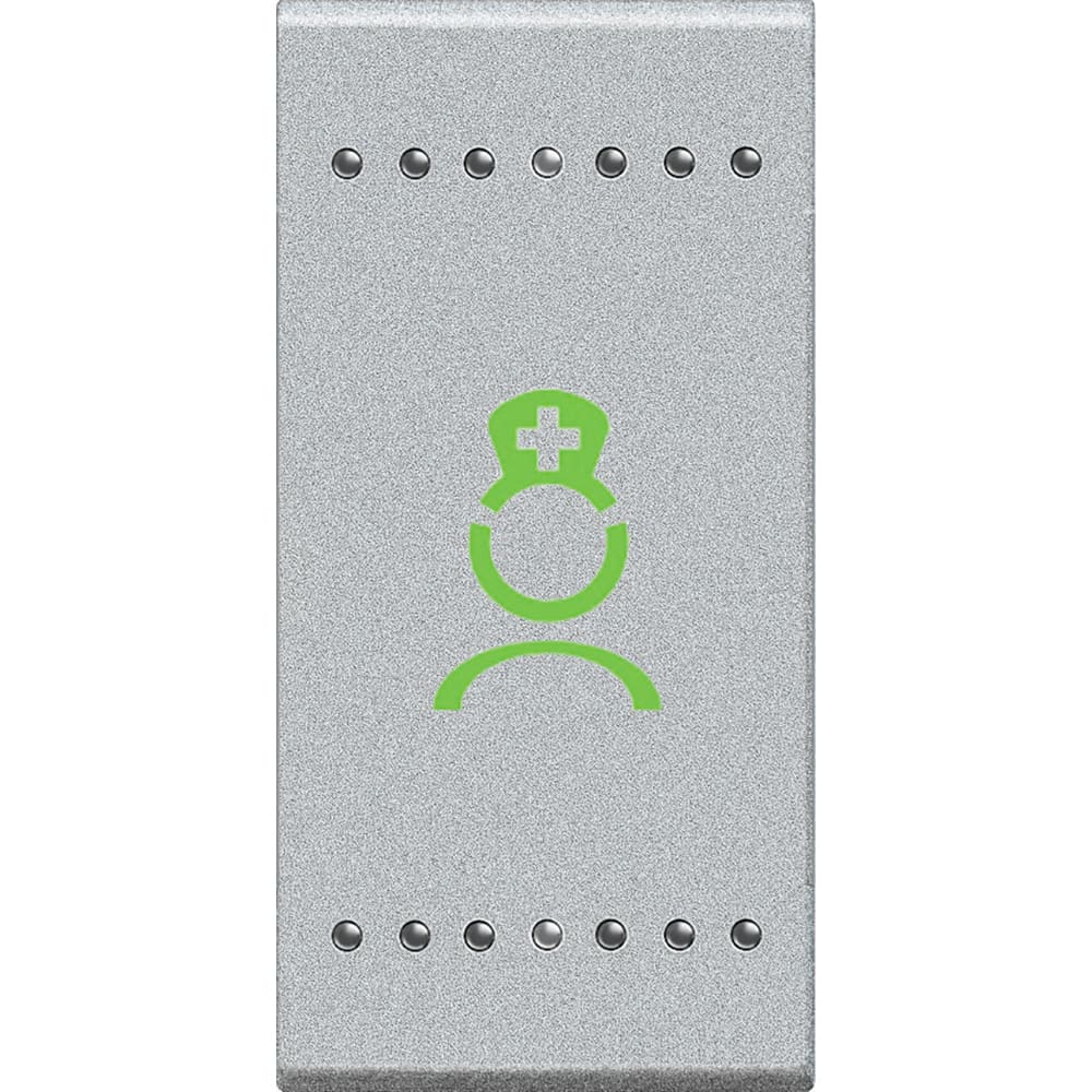 Annullo chiamata WC. Pulsante NC con icona infermiera di colore verde, da installare nel bagno annesso alla camera del paziente. Deve essere collegato al terminale di camera. Consente al personale di chiudere una chiamata bagno, nel rispetto delle norme VDE. Dispositivo 1 modulo - serie civile
