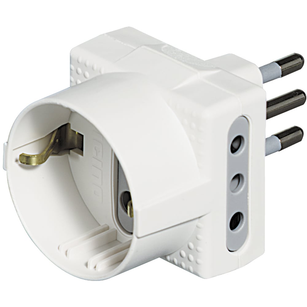Adattatore TRIS con 1 presa tedesca 2 prese 10A di colore bianco. Venduto in blister 90x122 mm (LxA)