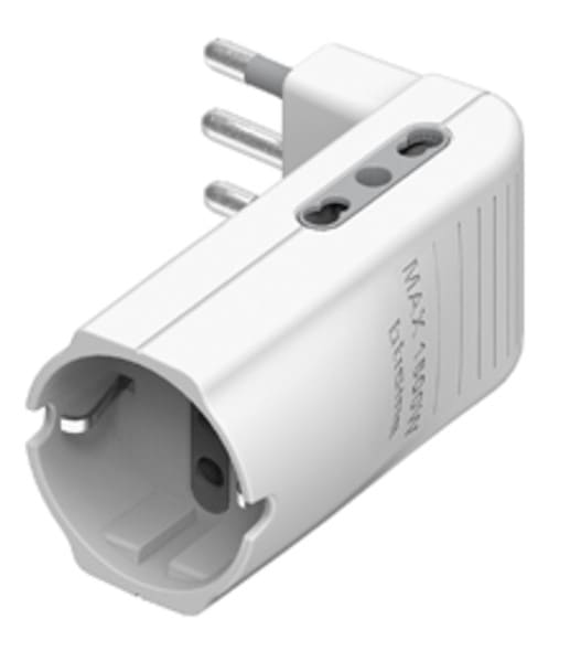 Adattatore salvaspazio Corner co 2 prese bipasso 10/16A e 1 presa tedesca tipo P30 e spina 16A di colore bianco