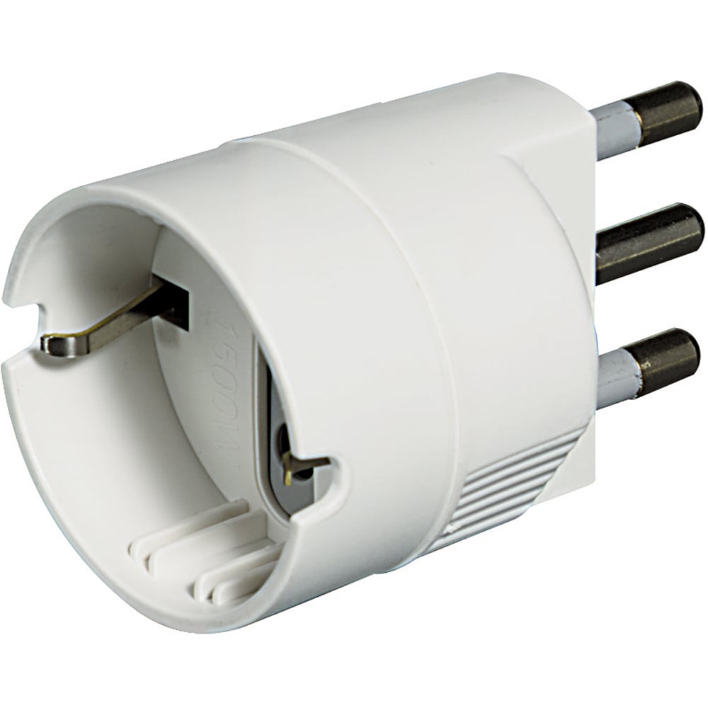 Adattatore con spina 2P+T 16A e presa standard tedesca di colore bianco. Venduto in blister 90x122 mm (LxA)