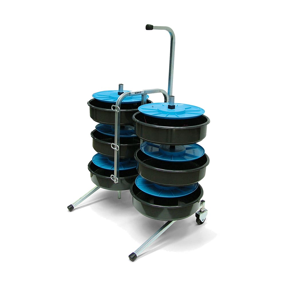Svolgicavo compatto composto da sei cestelli portamatasse sovrapposti, indipendenti, montati su telaio carrellato. Il telaio verticale, realizzato con tubolare 18x18 mm in acciaio zincato, prevede un manico telescopico per il trasporto, tre asole guidafilo e due bracci portamatasse semi-movibili per consentire l’utilizzo indipendente dei recipienti. Dotato di due gambe d’appoggio anteriori allungate per aumentare la stabilità e la resistenza dello svolgitore al tiro dei fili. I cestelli portamatasse Ø 300 mm realizzati in plastica antiurto consentono il contenimento di matasse standard di filo Ø 290 mm. Ciascun portamatasse è girevole sul proprio supporto e prevede il prelievo del filo dalla spira interna della matassa, il cui capo interno va alloggiato nell’apposita guida fissata sotto il coperchio mentre il capo esterno va fissato nel foro previsto sul fondo del cestello. Quest’operazione è fondamentale in quanto si preserva il filo da dannose torsioni derivanti dallo svolgimento; inoltre, passando attraverso l’asola guidafilo prevista sul telaio risulta essere sempre a disposizione dell’operatore. Date le modeste dimensioni, lo svolgicavo può essere comodamente contenuto all’interno del baule di un normale autoveicolo.