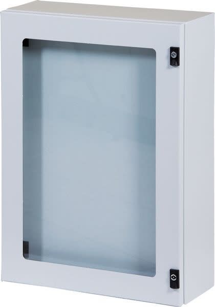 Cassetta composta da corpo, porta esterna trasparente, porta interna cieca, piastra interna fissata sul retro e piastrina passacavi • Corpo in lamiera pressopiegata e saldata sp. 12-15/10 • Porta trasparente in lamiera sp. 15-20/10 • Piastra interna in lamiera sp. 15-20/10 sendzimir • Guarnizioni, poliuretaniche applicate in colata continua • Cerniere reversibili con apertura 110° • Serratura con impronta doppia aletta • Verniciatura con polveri epossipoliestere termoindurenti in tinta RAL7035 bucciato •Grado di protezione IP 55 - TYPE 12