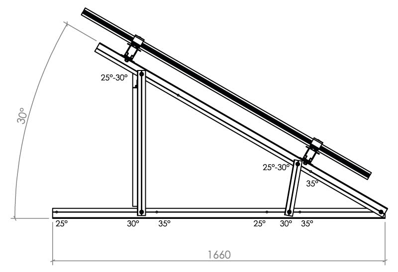Il sistema con supporto in alluminio KTO0122, consente di installare file singole di moduli fotovoltaici disposti in orizzontale con inclinazione regolabile 25°, 30°, 35°. Il montaggio a scatto dei morsetti universali terminale KMTU2950 e centrale KMCU2950 avviene in corrispondenza del lato corto dei moduli.