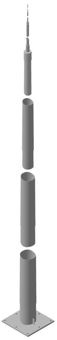 Palo componibile di captazione per fondamenta a bicchiere o in cemento, provato secondo CEI EN 62561-(1+2). Per la protezione da scariche dirette di impianti particolari, come p.es. impianti biogas, campi fotovoltaici a terra, impianti classificati Ex, depositi munizioni. Il palo è dimensionato conforme all'Eurocode per raffiche di vento max. 166 km/h. I pali vengono messi in opera sul posto, con la fondazione a bicchiere (elemento prefabbricato) o nelle fondamenta in cemento con la gabbia di ancoraggio.Esecuzione con piastra a flangia per un montaggio rapido e componenti conici del palo con sistema ad innesto, compresa statica provata. Altezza sopra terra 22,35 m.