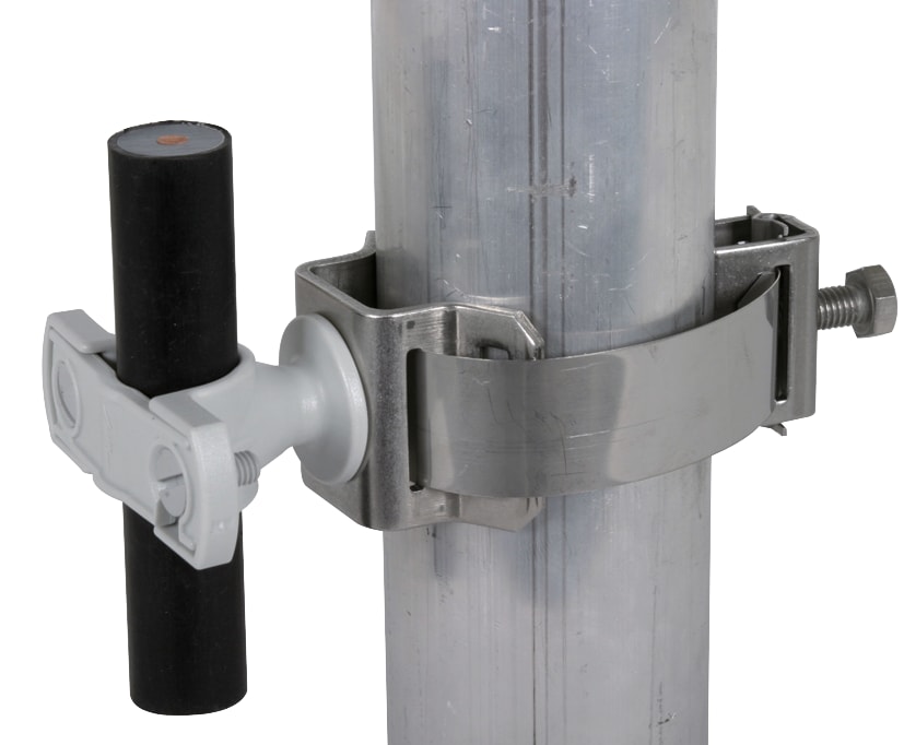 Staffa portafilo con fascetta di fissaggio, per il montaggio della conduttura HVI (nero) oppure conduttura HVI light, p.es. su tubi. Esecuzione con staffa portafilo in plastica.
