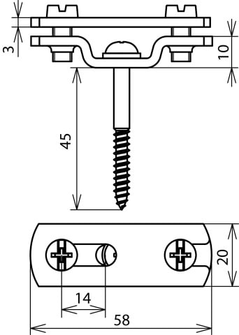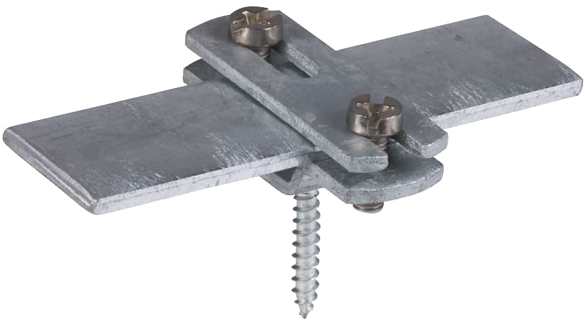 Staffa per conduttori piatti con cavalloto provvisto di fessura (forma costruttiva piatta), per il fissaggio di conduttori piatti. Esecuzione con asola (6,5 x 16 mm) e vite da legno premontata.
