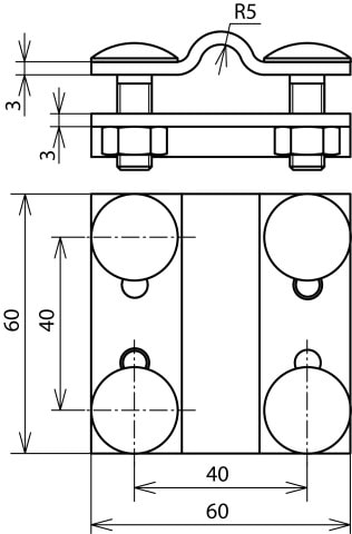 Morsetto a croce secondo CEI EN 62561-1 per collegamento fuori e sotto terra di conduttori tondi e piatti. Esecuzione con piastra intermedia e viti M8.