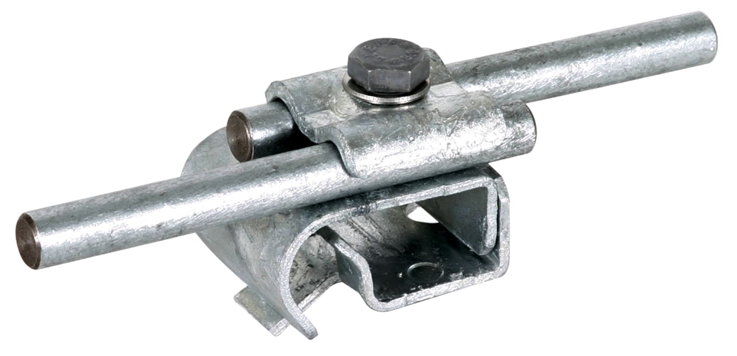 Morsetto per grondaia secondo CEI EN 62561-1, per il collegamento di conduttori tondi al bordo della grondaia. Esecuzione con cavallotto di fissaggio, posa del conduttore longitudinale o trasversale.