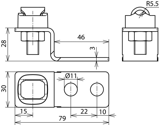 Elemento terminale da avvitare sui punti fissi di terra, per il collegamento ad es. di una barra equipotenziale o per collegare parti della costruzione (ad es. travi d'acciaio o simili) tramite avvitamento. Esecuzione con connettori KS per il collegamento di conduttori tondi.