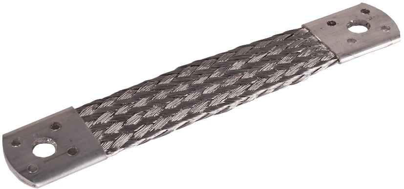 Treccia di ponticellamento secondo CEI EN 62561-1 per il collegamento di rivestimenti metallici (rivetti) oppure come elemento di compensazione della dilatazione per conduttori tondi. Esecuzione corta, connessione p.es. con connettore KS.
