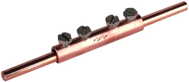 Manicotti di giunzione secondo CEI EN 62561-1 per il collegamento di due conduttori tondi in disposizione longitudinale con 4 viti M6. Esecuzione Cu 8.