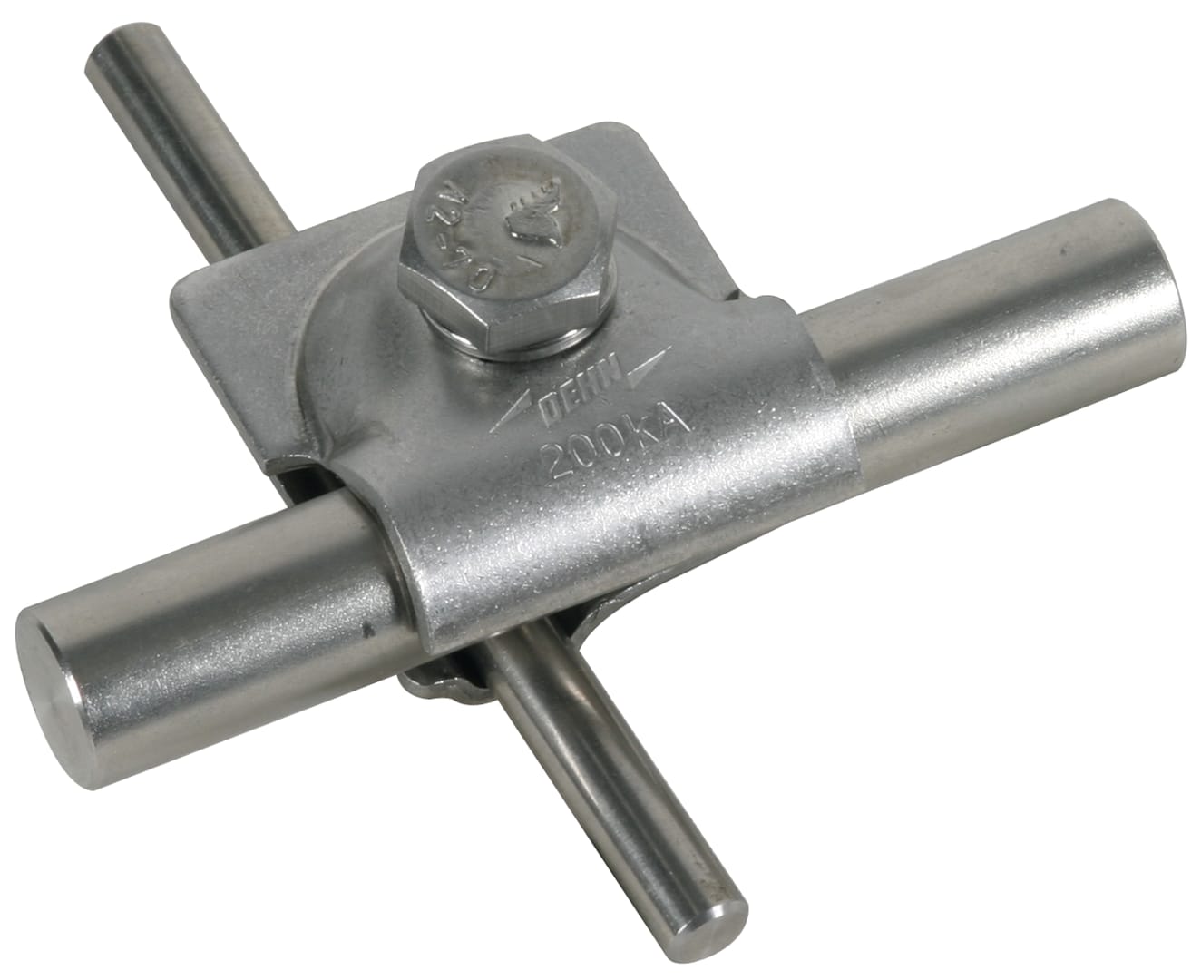 Morsetto MV per collegare un'adduzione a terra o un'asta di captazione (Ø 16 mm) con un conduttore tondo (Ø 8-10 mm). Portata di corrente di fulmine provata fino a 200 kA (10/350 µs) in appoggio alla norma CEI EN 62561-1. Esecuzione componibile con vite esagonale e filetto nella parte inferiore.