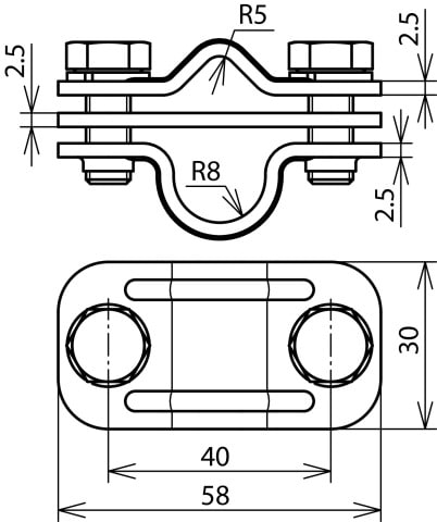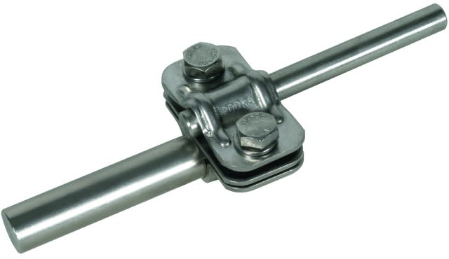 Morsetto di sezionamento per collegare un'asta di captazione o un'adduzione a terra con un conduttore tondo. Portata di corrente di fulmine provata fino a 200 kA (10/350 µs) in appoggio alla norma CEI EN 62561-1. Esecuzione con grova e piastra intermediaper conduttori tondi e piatti.