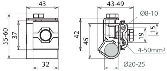 Morsetto di collegamento secondo CEI EN 62561-1, per connessione a croce e parallela d conduttori tondi o cordati su dispersori di terra. Esecuzione per dispersori di terra ?20-25 mm con 4 viti M8.