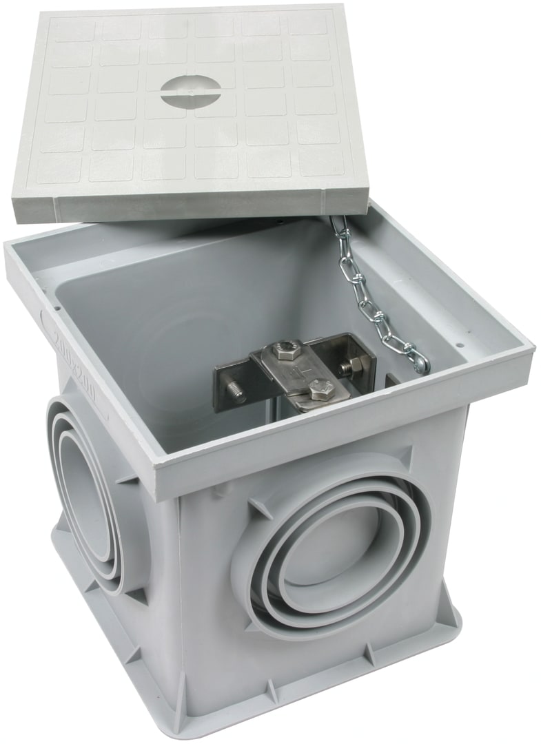 Pozzetto di terra secondo CEI EN 62561-5 per il montaggio sotto il suolo per separare la calata dall'impianto di terra durante le misurazioni. Esecuzione in plastica con punto di sezionamento integrato, facilmente raggiungibile.