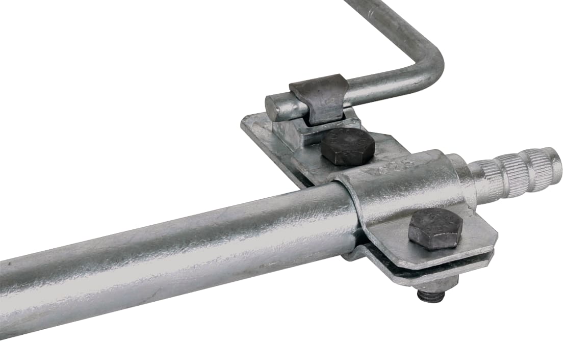 Collare di collegamento secondo CEI EN 62561-1 per la connessione di conduttori tondi su dispersori di profondità. Esecuzione con connettore KS (Td 7-10 mm) su un lato.