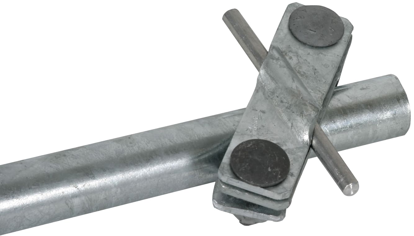 Collare di collegamento secondo CEI EN 62561-1 per la connessione di conduttori tondi, cordati e piatti su dispersori di profondità. Esecuzione obliqua con vite a testa piatta specifica per dispersori tubolari in accaio, anche per conduttori di terra nontagliati.