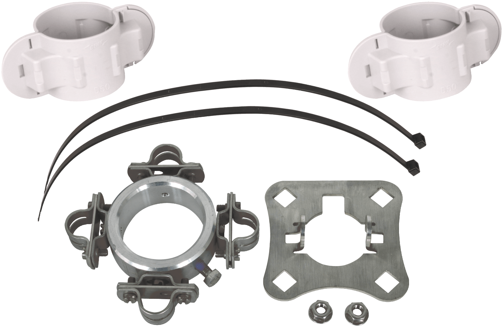 Set di fissaggio per il montaggio della conduttura HVI long sui tubi portanti, costituito di piastra di connessione (4 passaggi, compresi due dadi zigrinati) e anello di fissaggio con quattro staffe portafilo a fessura (D 20 mm) per il terminale (sono comprese due fascette nella confezione).