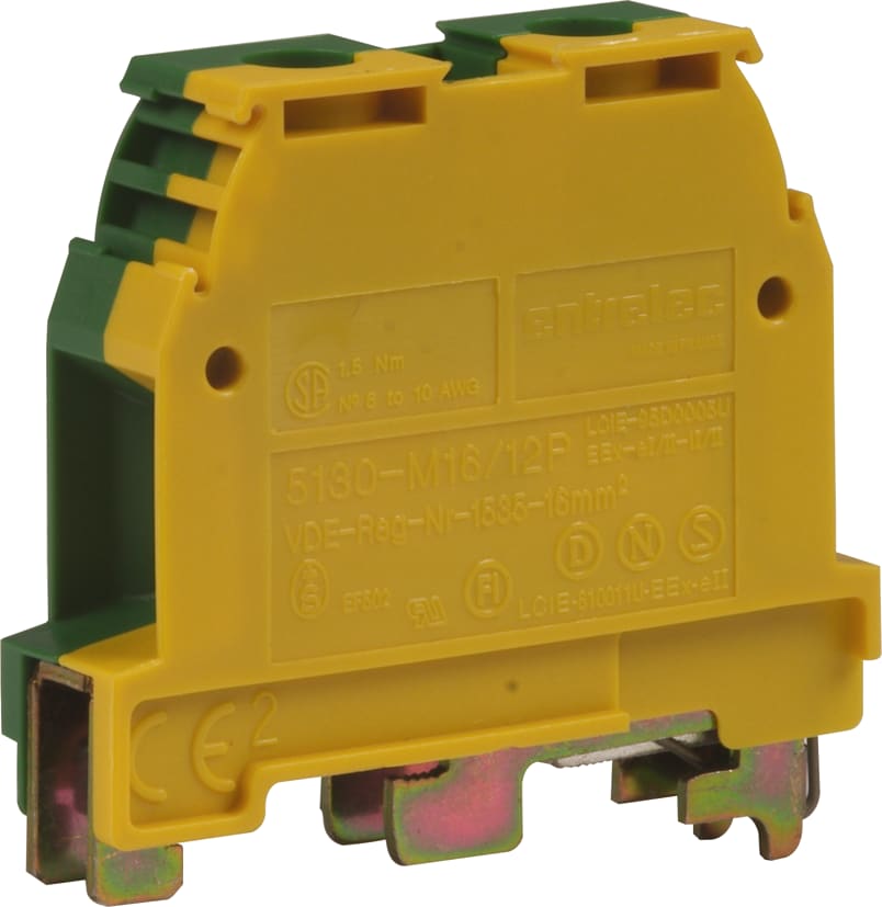Morsetto per conduttore di protezione 16/25 mm2 giallo/verde con base per guida profilata 35 mm per la messa a terra di profilati.