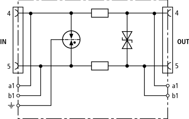 Limitatore di sovratensione coordinato energeticamente e senza corrente di fuga verso terra, per fil a/b, ASDB Uk0 o ADSL con prese RJ45 e connessioni a morsetto a vite supplementari. La piedinatura delle prese RJ45 è compatibile con RJ11/12. I morsetti a vite in parallelo sono più robusti delle prese RJ45 e aumentano la corrente impulsiva nominale di scarica a un totale di 10 kA.