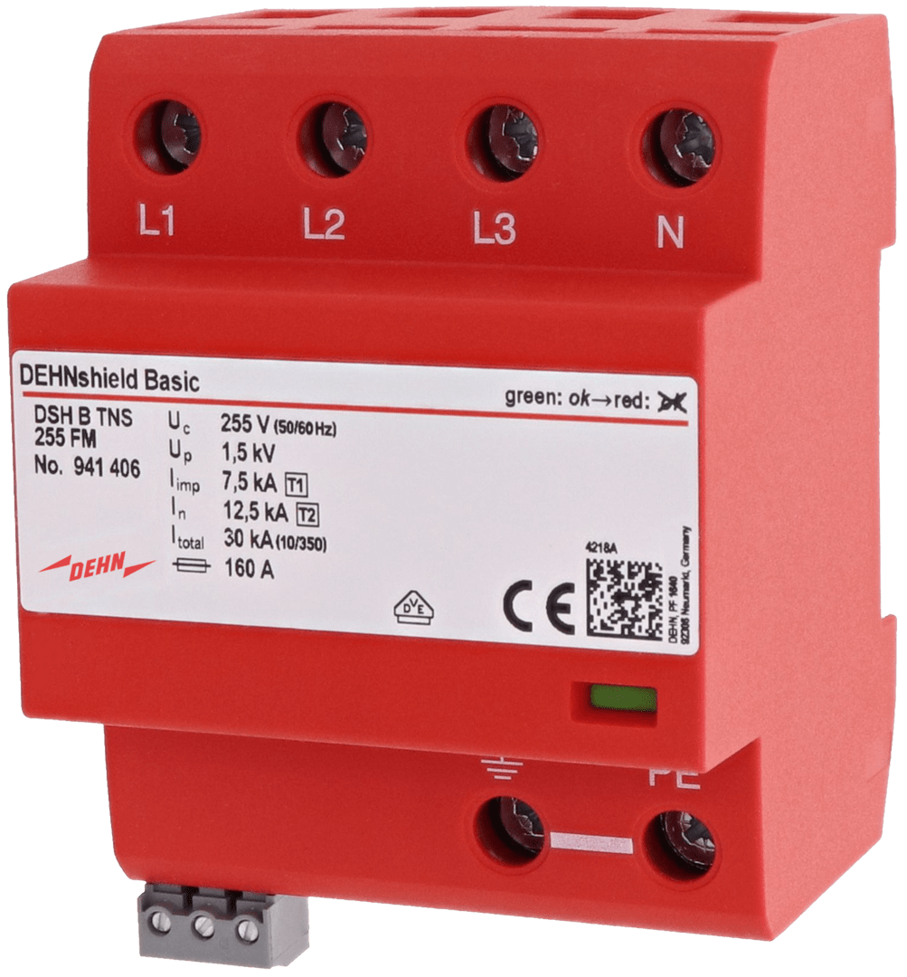 Scaricatore combinato multipolare, DEHNshield Basic, SPD Tipo 1 + Tipo 2 secondo CEI EN 61643-11 su base spinterometrica. La tecnologia spinterometrica per utilizzo in spazi ristretti con solo 1 unità / polo permette un'esecuzione compatta. Per la protezione di edifici residenziali in caso di installazione aggiuntiva e risanamento. Permette la protezione di utenze finali. Soddisfa tutti i requisiti della CEI 64-8 e della DIN VDE 0100-443. Per l'impiego direttamente nel punto di alimentazione dell'impianto elettrico.