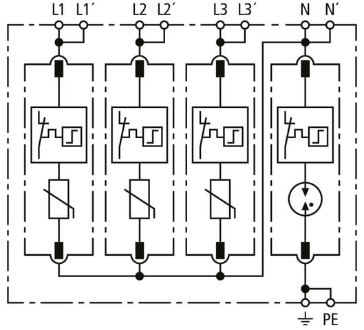 Limitatore di sovratensione multipolare DEHNguard MP, tipo 2 + tipo 3 secondo la norma EN 61643-11, costituito da basetta con moduli di protezione a innesto e doppio morsetto di collegamento Push-in adatto a cablaggio in derivazione e passante a "V"Elevata sicurezza dell?apparecchio tramite l?unita di monitoraggio con Thermo-Dynamic-Control. Per proteggere da sovratensioni gli impianti elettrici utilizzatori in bassa tensione. Per l?impiego nel concetto di protezione da fulminazione a zone nelle interfacce 0B ? 1 e superiori.