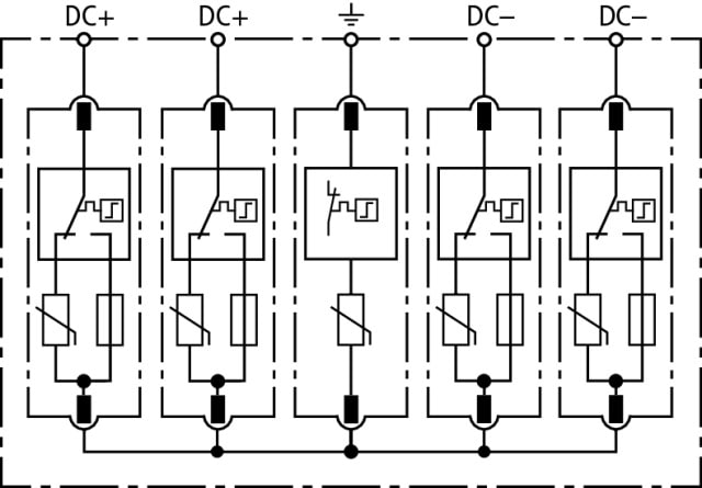 Limitatore di sovratensione multipolare DEHNguard M PV2 SCI, Tipo 2 secondo EN 50539-11 per la protezione di 2 ingressi MPP. Il dispositivo di manovra in corrente continua a tre gradini, composto da elemento base e modulo di protezione innestato con dispositivo di sezionamento e di messa in corto circuito integrato nel modulo che garantisce un sicuro sezionamento elettrico. Per la protezione da sovratensione di impianti elettrici utilizzatori in bassa tensione. Utilizzo secondo IEC 60364-7-712:2002-05 (Costruzione di impianti elettrici utilizzatori fotovoltaici).