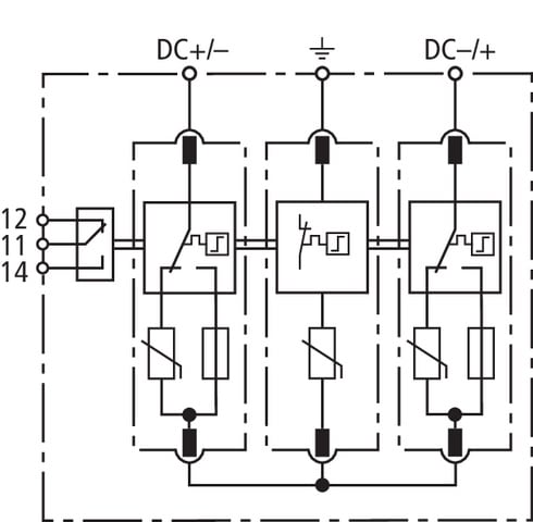 Limitatore di sovratensione multipolare DEHNguard M YPV SCI, Tipo 2 secondo EN 50539-11 con dispositivo di manovra in corrente continua a tre gradini, composto da base e moduli di protezione innestati. Dispositivo di sezionamento e di messa in corto circuito integrato nel modulo che garantisce un sicuro sezionamento elettrico. Per la protezione da sovratensione di impianti elettrici utilizzatori in bassa tensione. Per l'utilizzo secondo IEC 60364-7-712:2002-05 (Costruzione di impianti elettrici utilizzatori fotovoltaici).