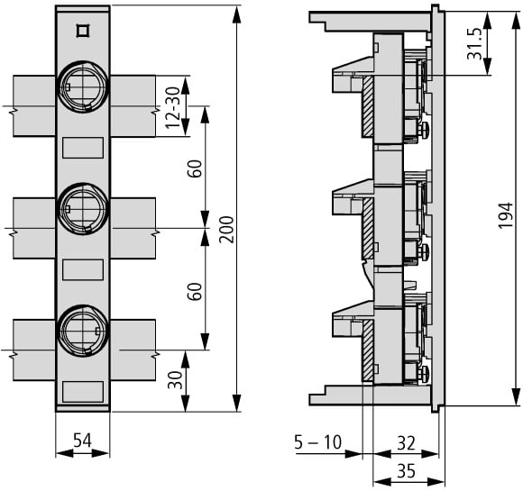Base per fusibile per montaggio su bus, corrente nominale di esercizio 63A, tensione nominale di esercizio 690V, dimensioni telaio DIII E33, larghezza di montaggio 54 mm