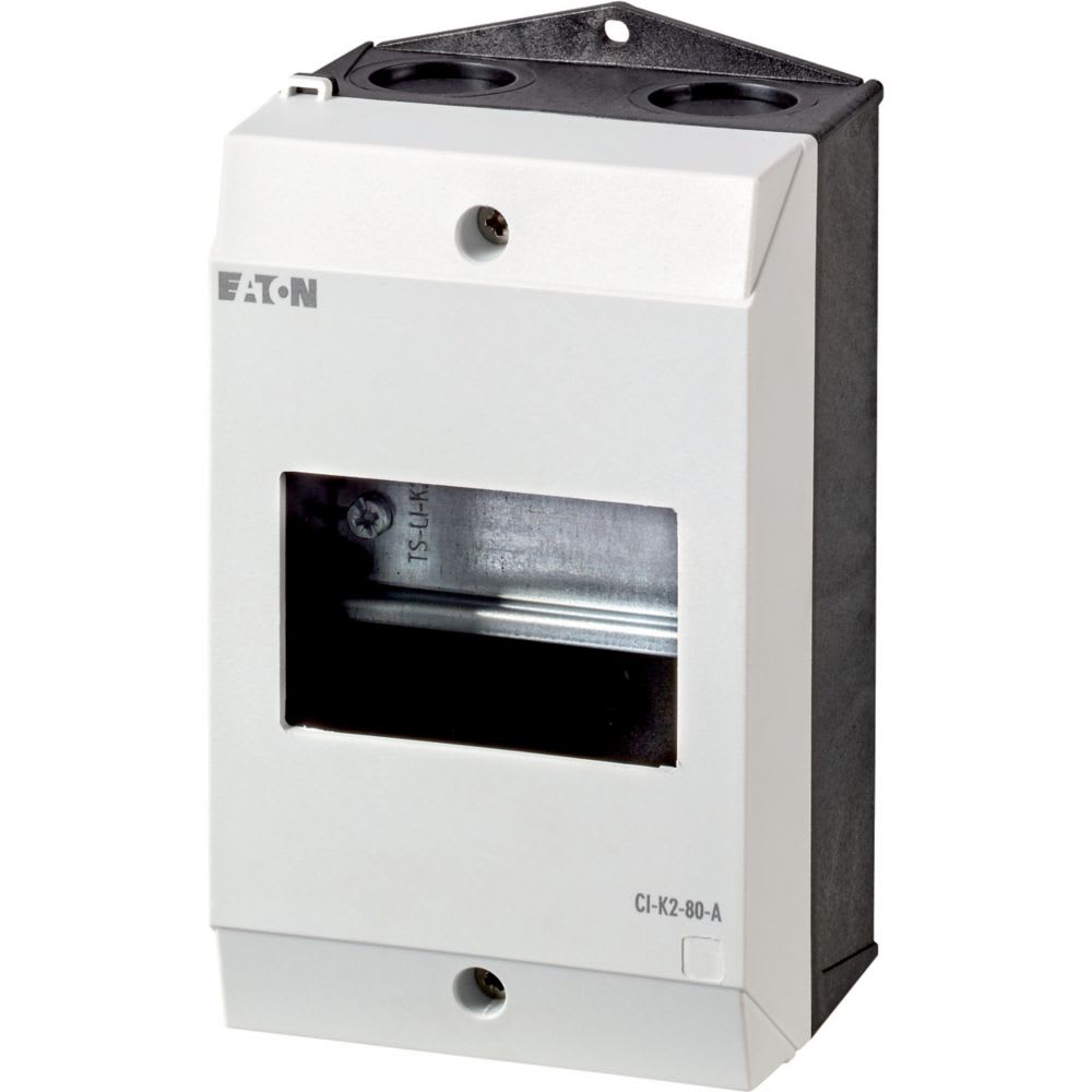 Custodia in materiale isolante, con dimensione coperchio, Assortimento: Custodia compatta CI-K, custodia vuota, Apparecchio singolo, Grado di protezione: IP30, Materiale: policarbonato rinforzato con fibra di vetro, Colore: Base della custodia RAL 9005, nero, Parte superiore della custodia grigio chiaro RAL 7035, Descrizione: setti sfondabili, metrici, nella parte superiore, inferiore e parete retro, membrana passante del cavo, Entrata cavi di comando, Indicatori luminosi L‐… montabili nel passaggio cavisfondabile della base M20/M25, Dimensione coperchio e guida DIN per apparecchi da incasso fino a 4 unità passo, Chiudere con strisce di copertura VST1 le unità passo non utilizzate (max. 2), Profondità di montaggio per guide DIN per montaggio a scatto, altezza 7.5 mm: 46 mm, Conformità alle norme: IEC/EN 60529, DIN EN 62208