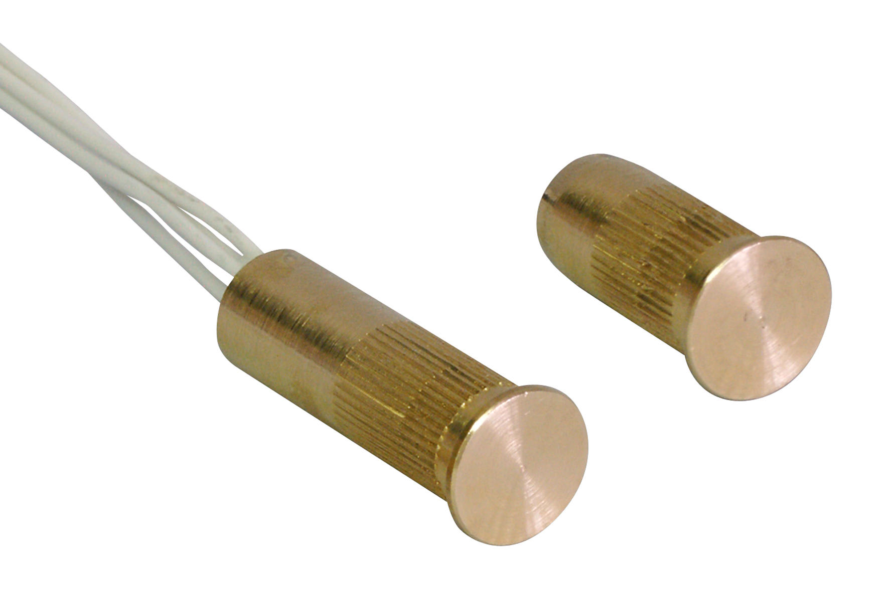 Contatto magnetico cilindrico corto in ottone. Montaggio ad incasso. Dimensioni compatte per serramenti a sezione ridotta, in alluminio, legno, PVC. Con loop filo antimanomissione (tamper)